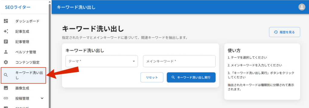 「キーワード洗い出し」機能は、指定したテーマとメインキーワードに基づいて、関連キーワードを自動抽出する便利なツールです。
