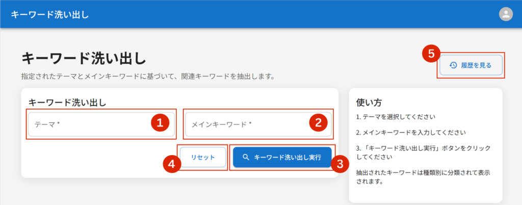 「キーワード洗い出し」画面では、必要な情報を入力し、関連キーワードを自動で抽出することができます。以下に、各入力項目と機能の説明を記載します。