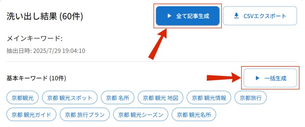 各カテゴリの右上にある「一括生成」ボタン、もしくは「全て記事生成」ボタンをクリックすると、対象カテゴリ内のキーワードをもとに記事生成を開始できます。