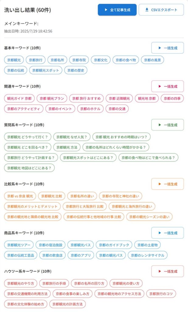 キーワード洗い出しを実行すると、選択したテーマと入力したメインキーワードに基づいて、関連キーワードが自動で分類・表示されます。