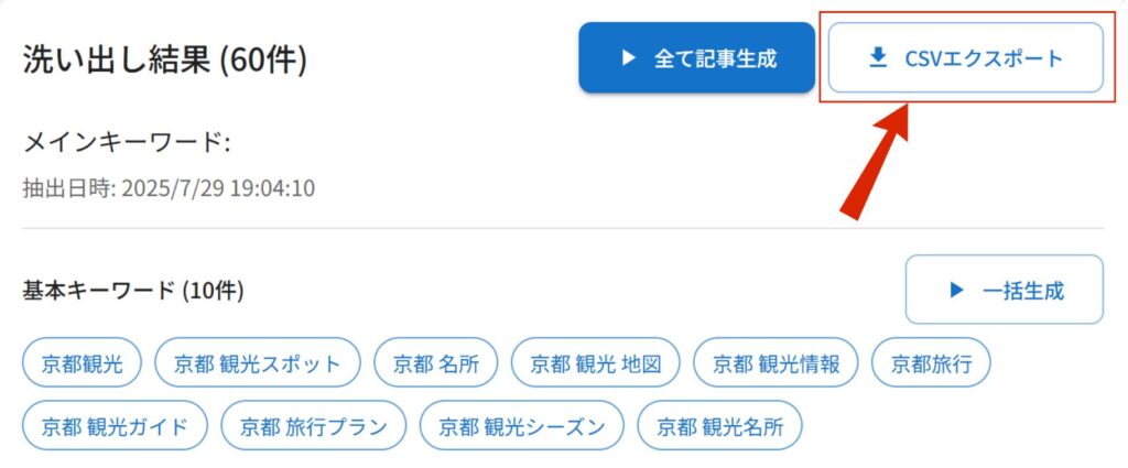 「CSVでエクスポート」ボタンを押すと、洗い出した全キーワードをCSV形式でダウンロードできます。