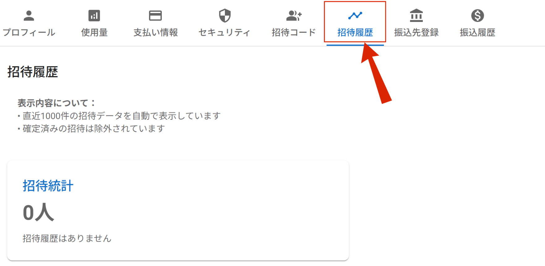 ここでは直近1,000件までの招待データが確認でき、誰をいつ招待したか、その人が登録を完了したかどうかも把握できます。