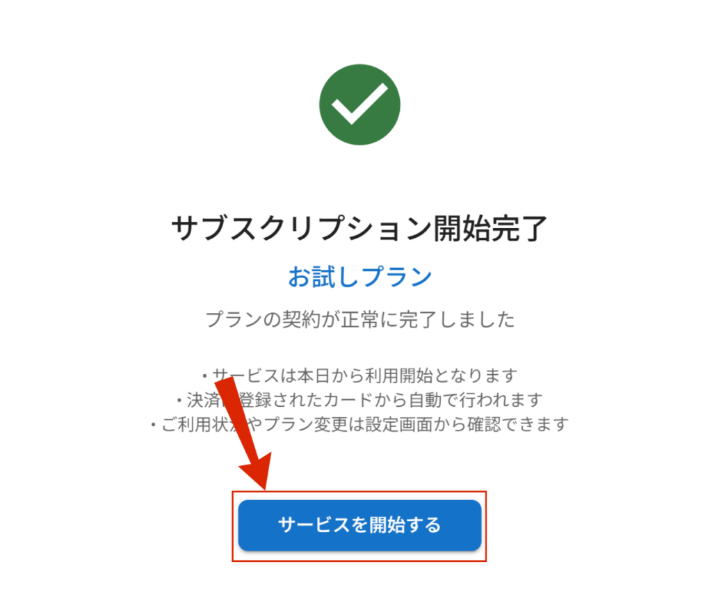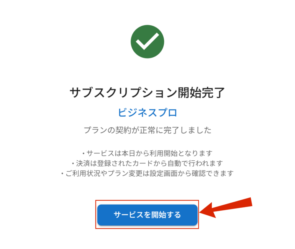 最後に「サブスクリプション開始完了」の画面が表示されればプランアップ完了です。