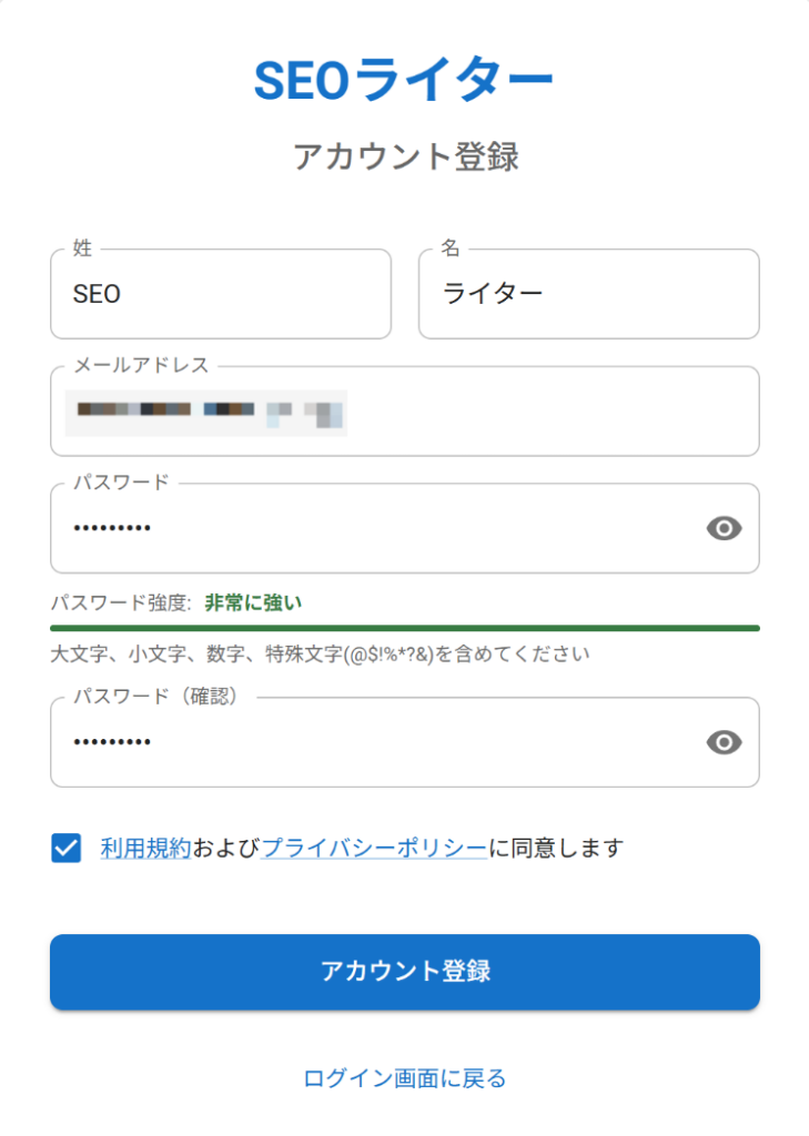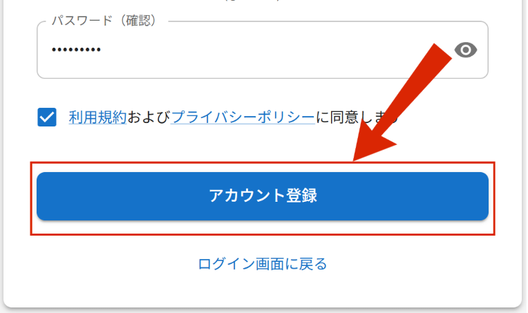 入力が完了したら「利用規約およびプライバシーポリシーに同意します」にチェックを入れ、「アカウント登録」をクリックしてください。
