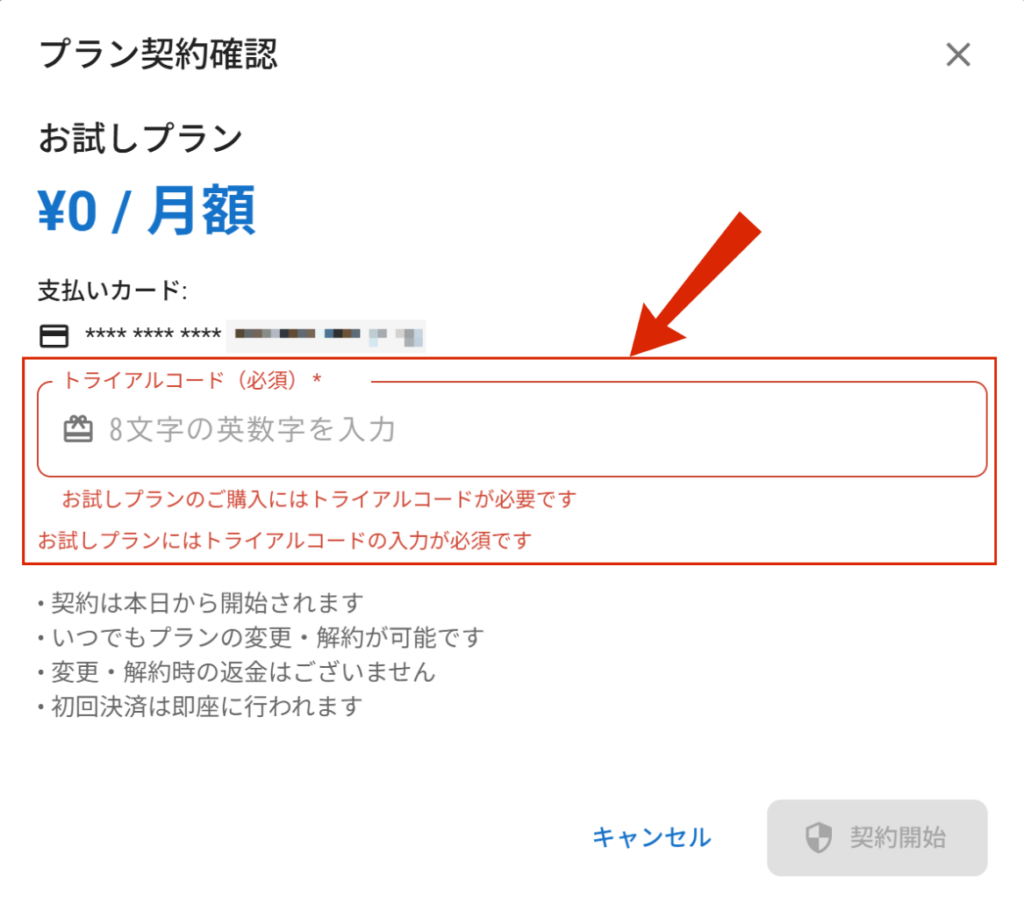 プラン選択とトライアルコード入力
