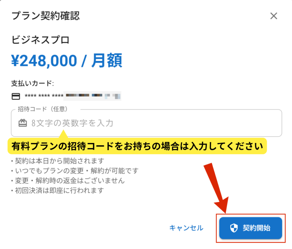 有料プランの招待コードを持っている場合は入力してください。招待コードがない場合でも、そのまま契約を開始できます。
