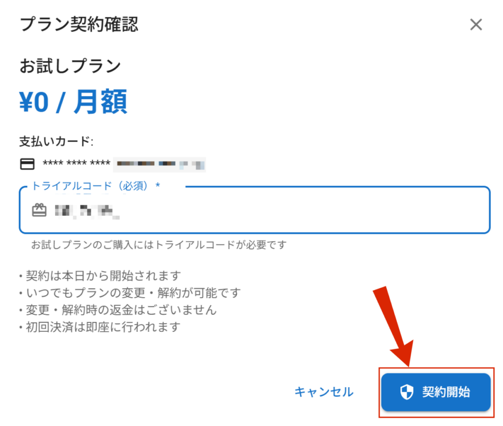 プランの選択とトライアルコードの入力