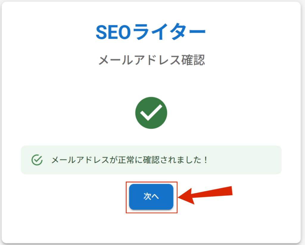 「メールアドレスが正常に確認されました」という画面が表示されたら、「次へ」を押して次のステップに進みます。