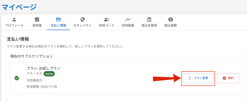 お試しプランでもカード情報の入力は必須ですが、この時点で自動課金されることはありません。翌月以降、継続して利用する場合には「プラン変更」を行うことで有料プランへ移行できます。