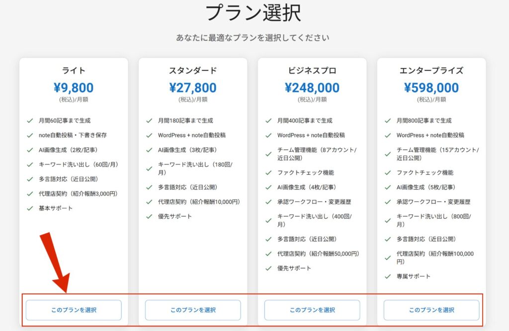 ここで「サブスクリプション開始完了」の画面が表示されれば登録は完了です。最後に「サービスを開始する」を押せば、いよいよ記事生成を始められます。