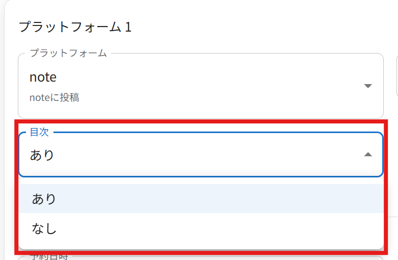 「あり」を選択すると、note投稿時に自動で目次ブロックが挿入されます。