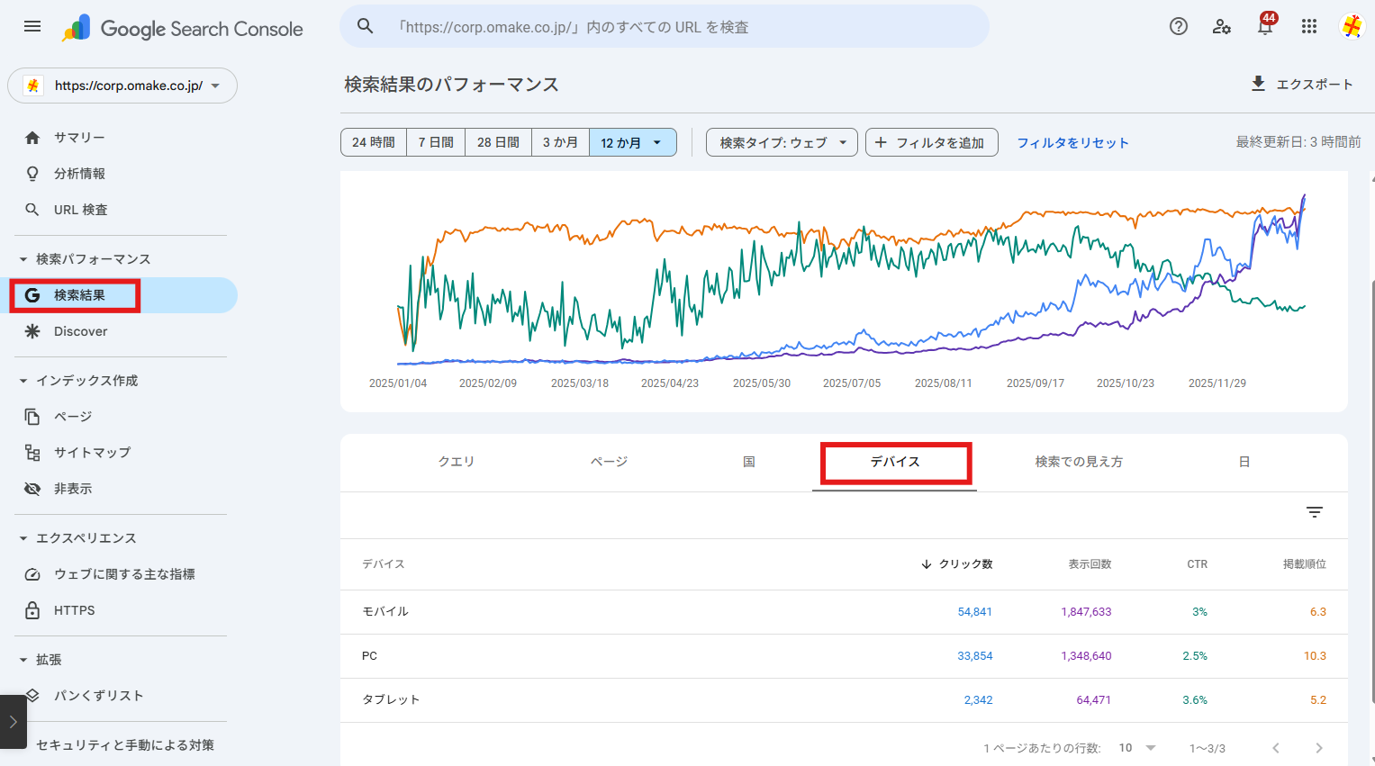 Google Search Consoleでは「デバイス」タブから、ユーザーがスマホ(モバイル)で見ているのか、PCで見ているのかも分かります。
