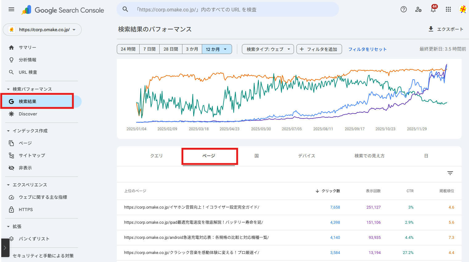 「ページ」タブに切り替えると、URLごとのパフォーマンスが一覧で表示されます。