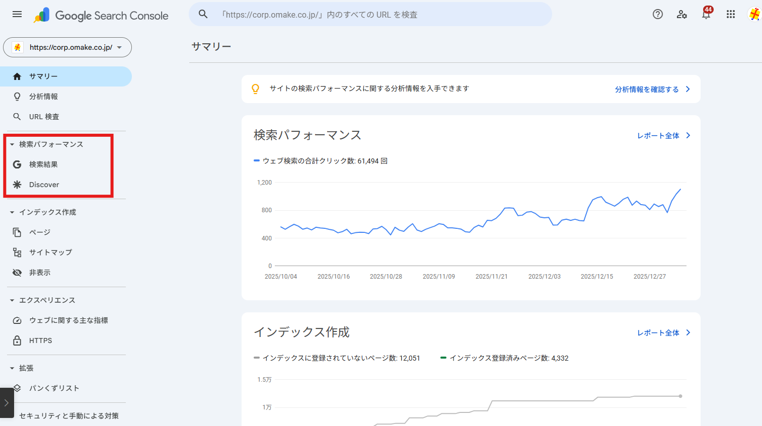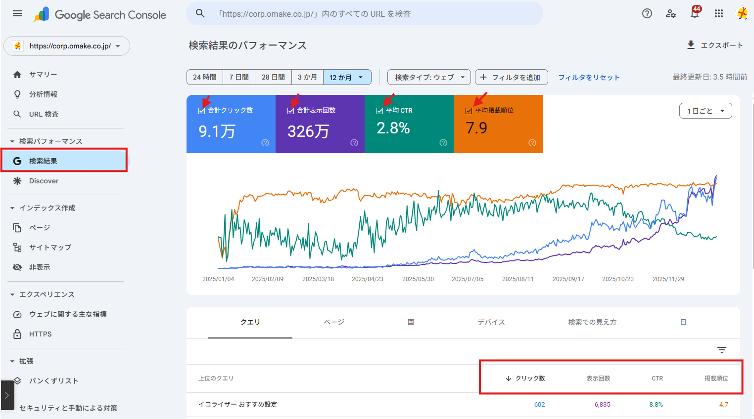 「検索結果」をクリックすると、画面上部にサイトの健康状態を示す4つの重要指標が表示されます。