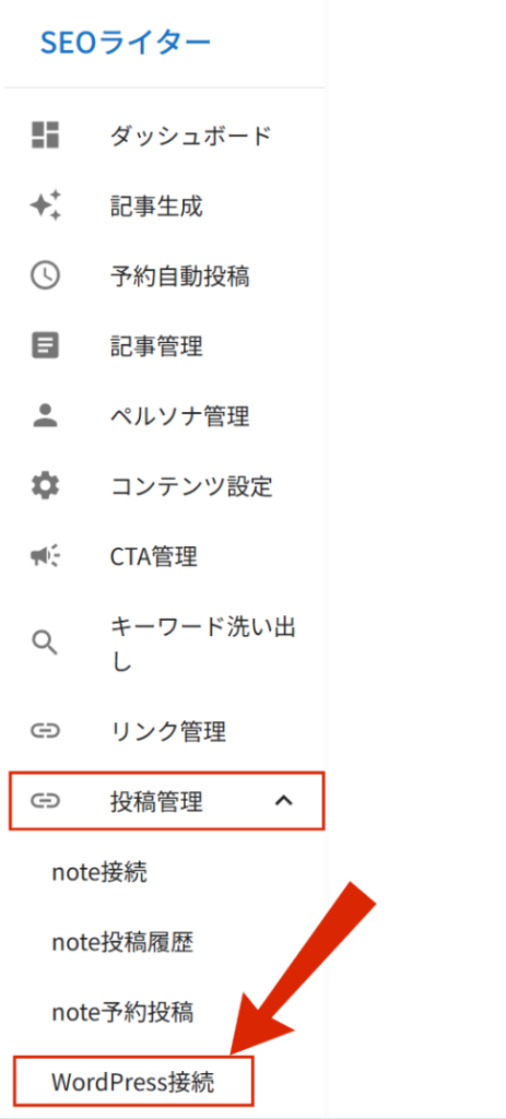 まず、SEOツール管理画面左端の「投稿管理」メニューから、「WordPress接続」を選択してください。
