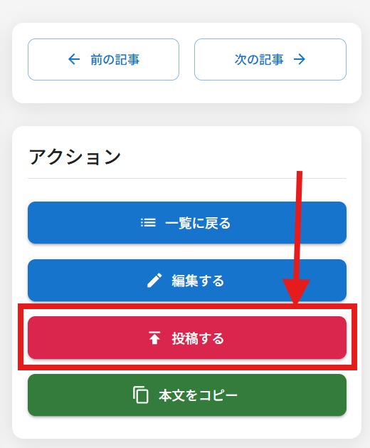 修正・確認が完了した記事は、詳細画面の「アクション」ウインドウ内、「投稿する」ボタンから直接各種プラットフォームへ投稿可能です。