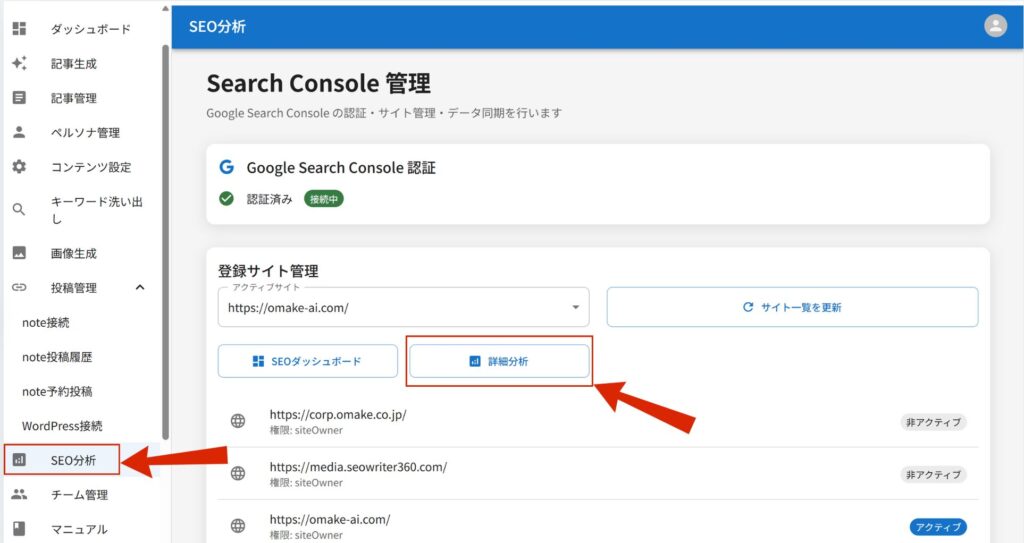 詳細分析画面では、Google Search Console と連携されたSEOデータをもとに、
