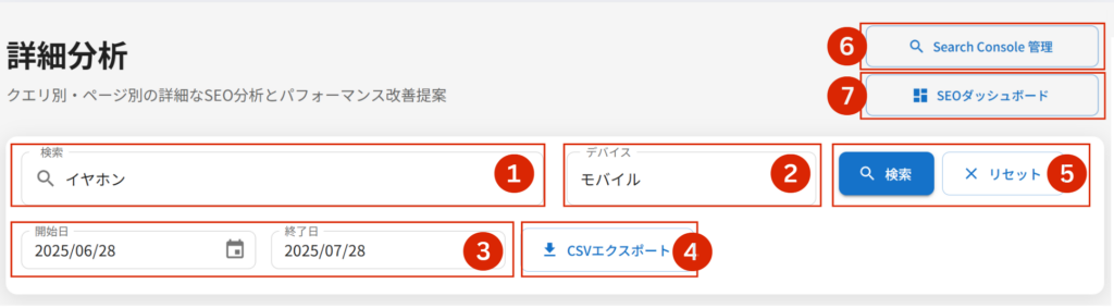 SEOツールの「詳細分析画面」では、Google Search Consoleと連携したデータをもとに、検索クエリ別・ページ別のSEOパフォーマンスを可視化することができます。