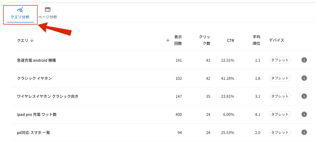 「クエリ分析」タブでは、ユーザーが実際に検索したキーワード(検索クエリ)ごとの検索パフォーマンスを確認できます。