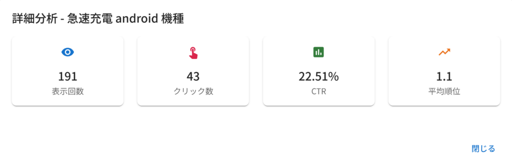 | 表示回数 | 検索結果に表示された回数。露出の目安になります。 |